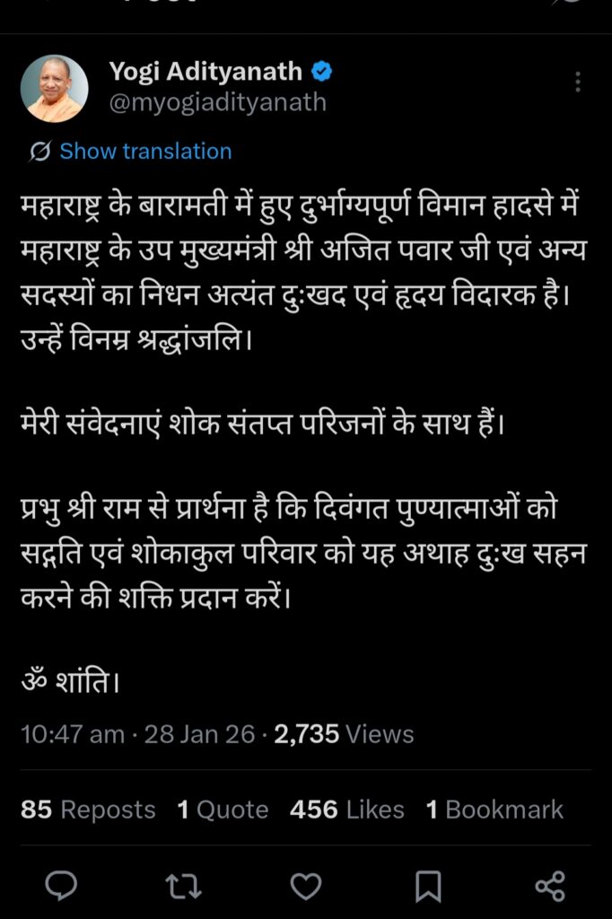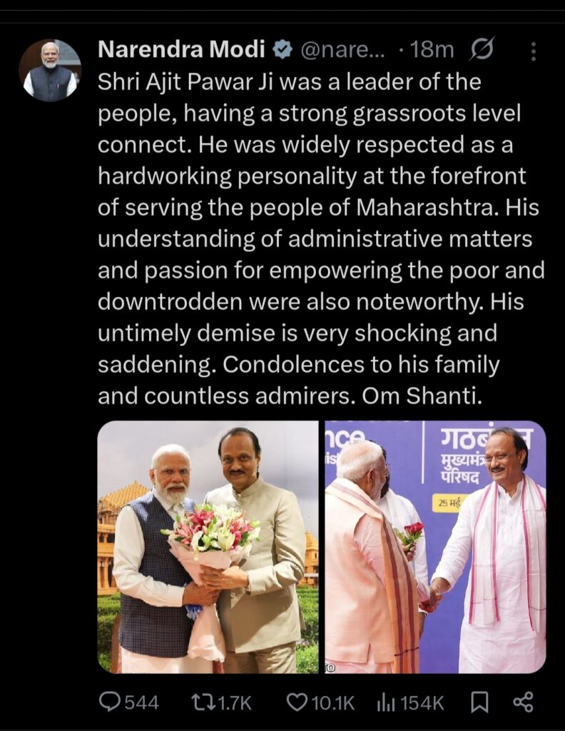 मुंबई/दिल्ली। महाराष्ट्र के उपमुख्यमंत्री अजित पवार के निधन की खबर से देश की राजनीति में शोक की लहर दौड़ गई है। मुंबई से बारामती जा रहा उनका विमान लैंडिंग के दौरान दुर्घटनाग्रस्त हो गया, जिसमें अजित पवार सहित विमान में सवार अन्य लोगों की मौत हो गई। बताया जा रहा है कि यह हादसा सुबह करीब 8 बजकर 45 मिनट पर बारामती में लैंडिंग के समय हुआ। हादसे के बाद मौके पर अफरा-तफरी मच गई। विमान का अगला हिस्सा पूरी तरह क्षतिग्रस्त हो गया और घटनास्थल से धुएं के गुबार उठते देखे गए। इस बीच प्रधानमंत्री नरेंद्र मोदी ने सोशल मीडिया प्लेटफॉर्म ‘एक्स’ पर शोक संदेश जारी करते हुए कहा कि “अजित पवार जनता से जुड़े हुए जमीनी नेता थे। उनका असामयिक निधन बेहद दुखद और स्तब्ध करने वाला है। उनके परिवार और समर्थकों के प्रति मेरी गहरी संवेदनाएं।”वहीं केंद्रीय मंत्री नितिन गडकरी ने भी अजित पवार के निधन को राजनीति के लिए बड़ी क्षति बताया। उन्होंने कहा कि अजित पवार उनके करीबी मित्र थे और उनका जाना व्यक्तिगत व राजनीतिक दोनों स्तरों पर अपूरणीय क्षति है।